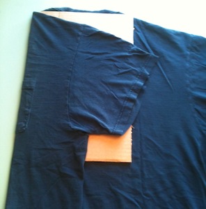 2. Place this cardboard piece on the top center of your t-shirt. Fold over one sleeve, as shown. 10 seconds.