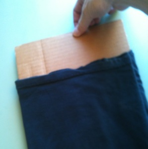 1. Grab a sturdy piece of cardboard and cut it to one third of your drawer width by half your t-shirts’ length.  About 8 minutes.