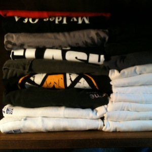 I am filing my t-shirts because I learned a terrific tip from CPO Alejandra Costello.  She stores her t-shirts vertically, so you can get a better view of them. Brilliant! Here is her video explaining how she does it and the tool she uses. If you are too lazy to watch her 4:47 minute video or too lazy and too cheap to order her tool, like I am, here’s what you can do.